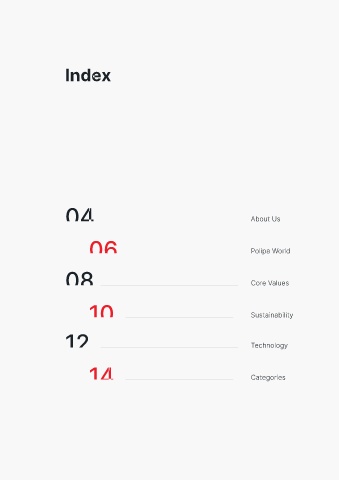 Index 04 About Us 06 Polipa World 08 Core Values 10 Sustainability 12 Technology 14 Categories